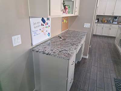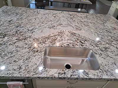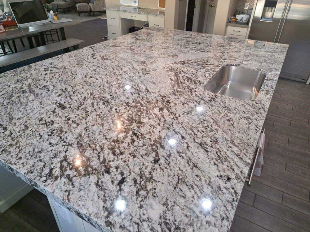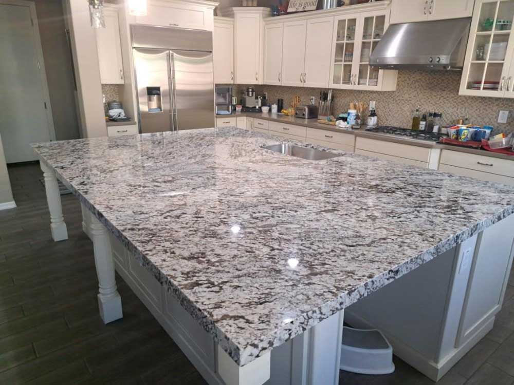 Breckenridge is a granite with a white background and light blue undertones. There is also a blend of clear and milky quartz running throughout.